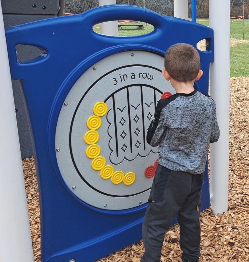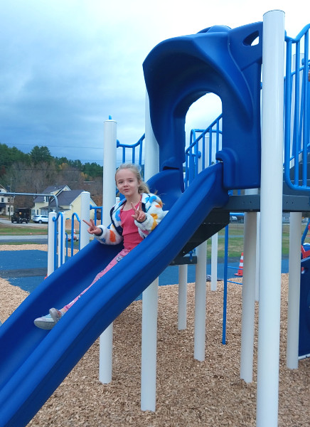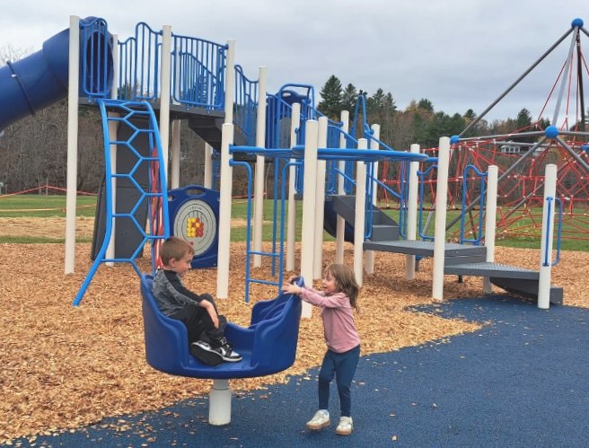 October 21, 2025: Last week, the blue rubber surface was installed around the base of the playground modules with wood chips filling in the rest of the area. These young residents were among the first to test run the new installation and it seems to have passed muster.