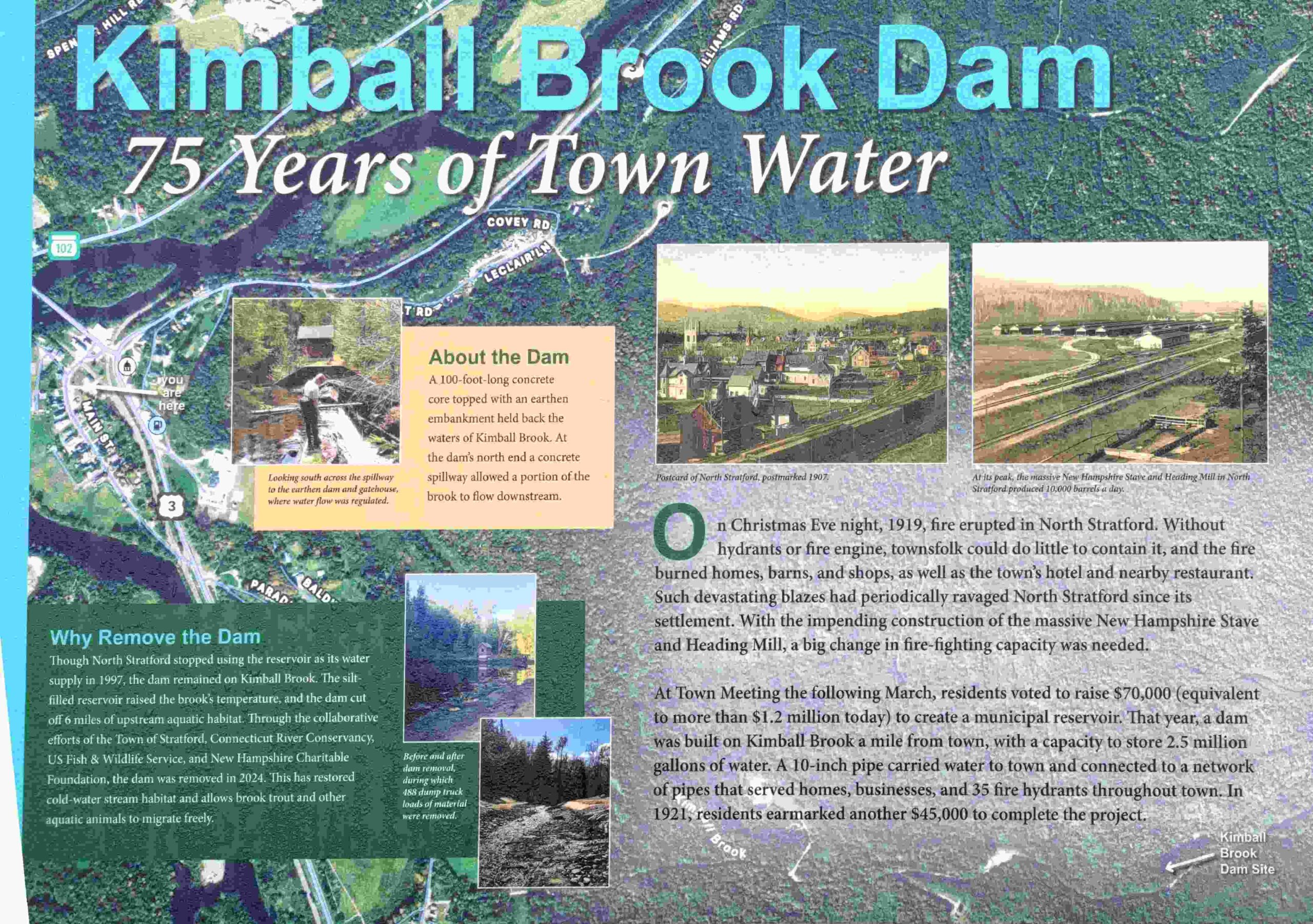 The Kimball Brook Damn was completed in 1921, creating a reservoir with the capacity to hold 2.5 million gallons of water, which was the initial public water supply for the village of North Stratford. The reservoir was retired in 1997, when the Town developed their new water supply system, switching from an open-water source to groundwater wells.
