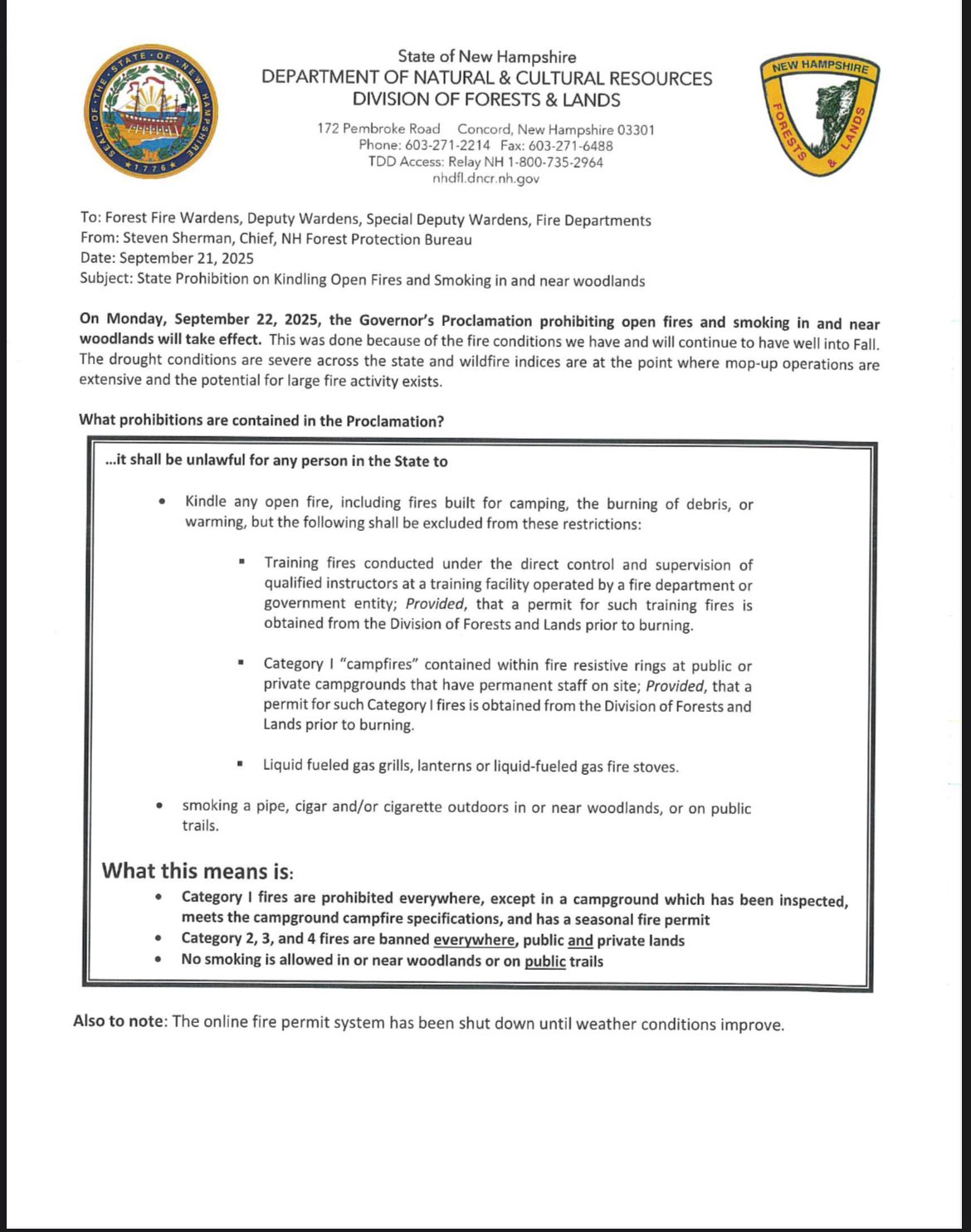 Due to the severe drought conditions across the state, the Governor’s Office issued a prohibition of open fires and smoking in and near all woodlands. The fire ban came into effect on Monday, September 22, 2025 and will continue until weather conditions improve, likely well into fall.